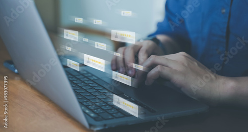 Customer review good rating concept, hand pressing user and five star icon on visual screen for positive customer feedback, testimonial and testimony, user comment and feedback for review.