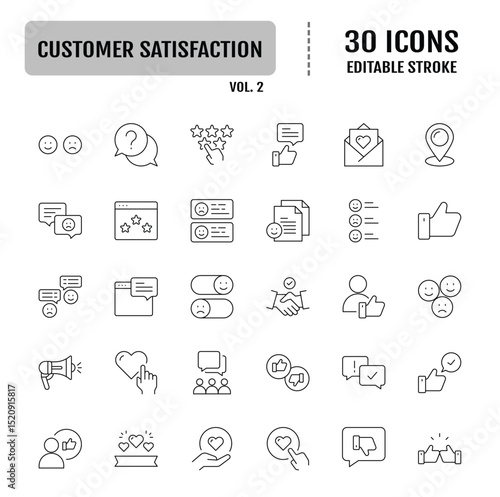 Customer satisfaction line icon set. Containing Customer Support, Satisfaction Survey, Quality Service, Feedback Loop, Five Star Rating. Editable stroke. Vector illustration