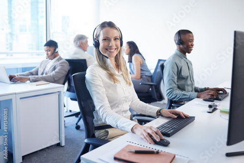 Customer service, call center and portrait of woman on computer for insurance claim, sales and consulting. Corporate, office and coworking, headset or communication with crm support or telemarketing
