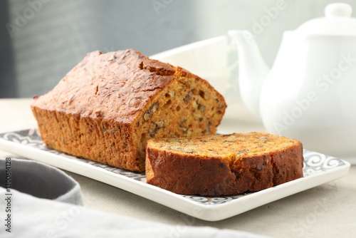 Cut homemade carrot cake with nuts on light grey table, closeup