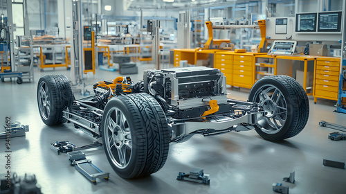 Cutaway An exploded view of the electric vehicle chassis on a factory floor, with various components such as the battery, motor, and suspension floating apart to showcase their individual details