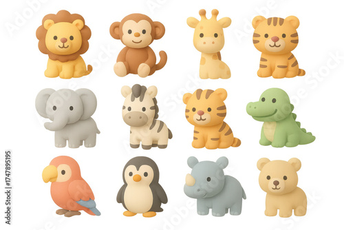 Cute 3d animal figures set featuring playful cartoon safari and jungle creatures