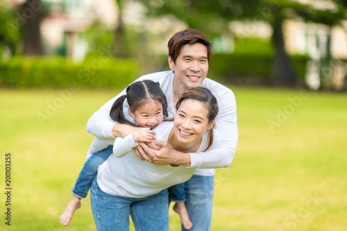 Cute Asian girl on neck parents big happy laughing and run around together.Happy family piggybacking adorable little daughter is smiling. selective focus at girl eye.