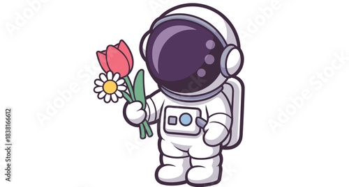 Cute Astronaut Holding Bouquet of Tulip and Daisy Flowers