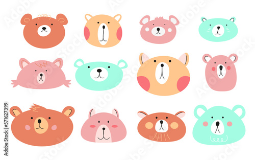 Cute baby bear avatar vector illustration. Hand drawn bear faces. Colorful animal face for child
