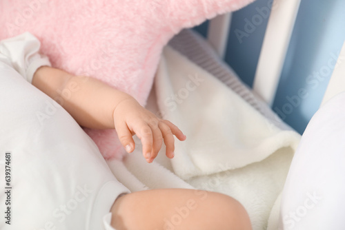 Cute baby lying in crib, closeup