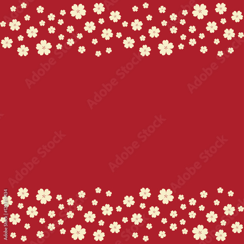 Cute background pattern border frame with many repeating spring cherry flowers isolated on the red fond. Space for invitations or different events greeting cards text. Vector illustration eps