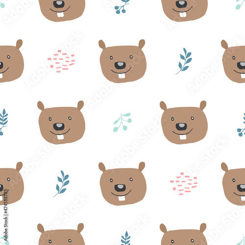 Cute Beaver Seamless pattern. Cartoon Animals in forest background. Vector illustration