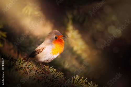 Cute bird robin. Green forest background. Bird: European Robin. Erithacus rubecula.