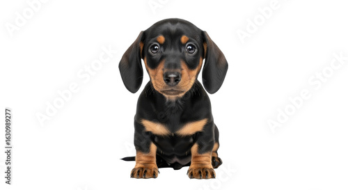 Cute Black and Brown Puppy Sitting on White Background Looking at Camera