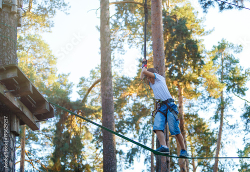 cute boy goes on skateboard on the treetops in adventure rope park. he will cope with all challenges!