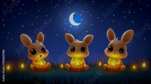 Cute Bunnies with Lanterns Under a Starry Night Sky..