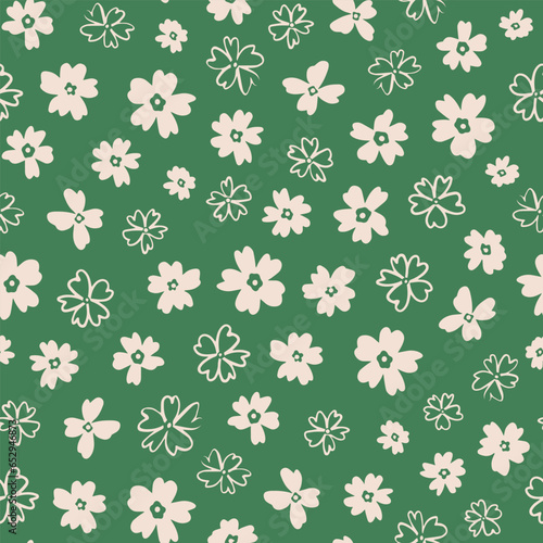 Cute, calico floral seamless repeat pattern. Random placed, vintage botany all over surface print on green background.