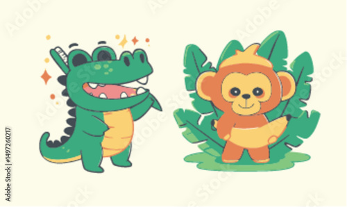 Cute Cartoon Alligator and Monkey Characters with Tropical Leaves Background