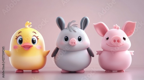 Cute cartoon animal characters, standing in a row, with pastel colors, 3d render, adorable.