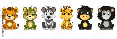 Cute cartoon animals in sticker set featuring lion, tiger, monkey, leopard, and more. Perfect for children decor or educational materials