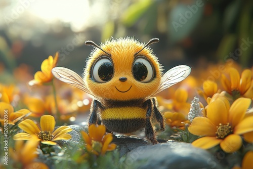 Cute cartoon bee smiles while surrounded by vibrant flowers in a sunny garden