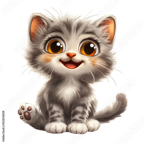 Cute cartoon cat with big eyes and joyful expression, featuring fluffy gray fur and playful pose