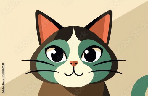 Cute cartoon cat with large expressive eyes and colorful facial markings