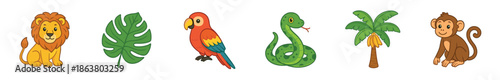 Cute cartoon jungle animals and plants set including a lion, monkey, snake, parrot, monstera leaf, and palm tree, presented as a colorful collection for kids