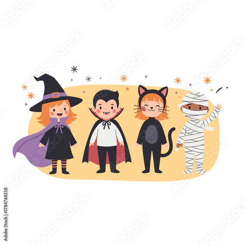 Cute Cartoon Kids in Halloween Costumes: Witch, Vampire, Cat, and Mummy Characters