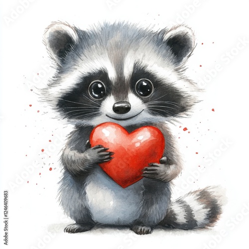 Cute cartoon raccoon holding a red heart in an adorable style