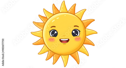 Cute cartoon sun with a smiling face and blushing cheeks, simple and colorful design, transparent background