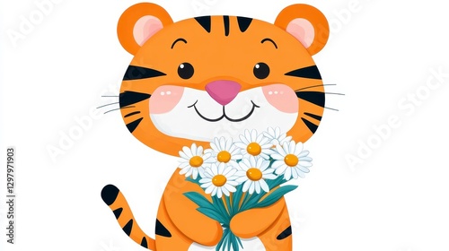 Cute Cartoon Tiger Holding a Bouquet of White Daisies