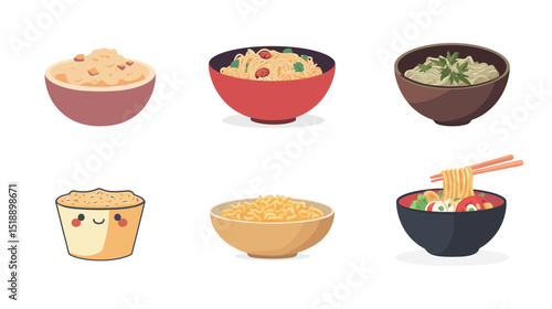 Cute cartoony ramen vector illustration featuring a steaming bowl of noodles with expressive face, chopsticks, toppings like egg and seaweed, in playful kawaii style perfect for Asian food themes,