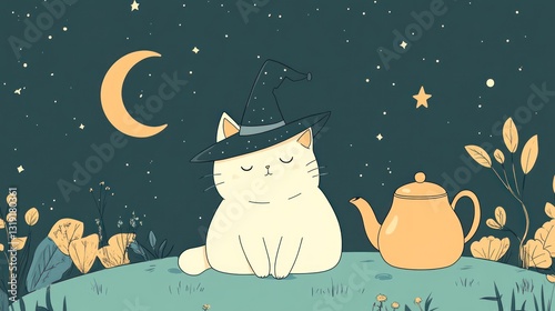 Cute Cat in Witch Hat, Night Scene, Teapot, Fantasy, Peaceful