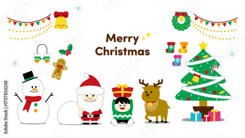 Cute Christmas Illustration Set (Santa, Reindeer, Presents, Tree, Snowman) – with text, transparent background(クリスマスイラスト)