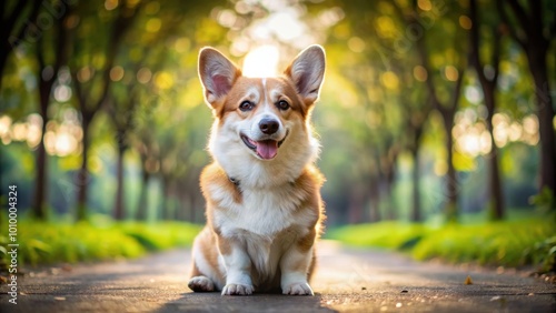 Cute corgi dog sitting obediently during a leisurely walk in the park , corgi, dog, pet, sitting, walk, park, leisure, obedient