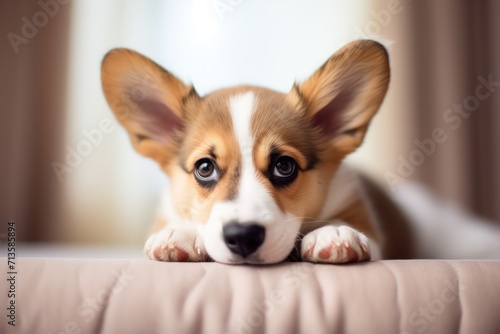 Cute corgi Pembroke purebred puppies at home closeup minimal portrait.