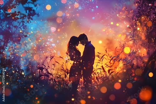 Cute couple on a romantic date. People in love. Nature and bokeh lights background