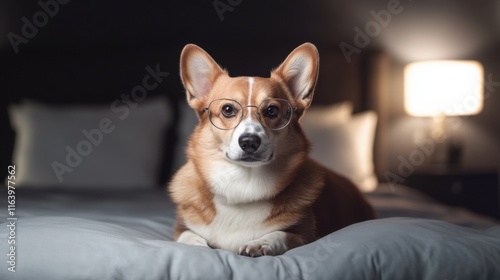Cute dog relaxing with glasses on bed - cozy home comfort and adorable pet theme
