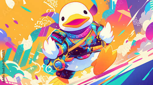 Cute duck wearing Japanese samurai armor, cool poses, cute kawaii, simple, smiling happy. neon psychedelic background