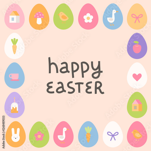 Cute Easter greeting card template. Happy Easter. Square eggs frame with cartoon illustrations.