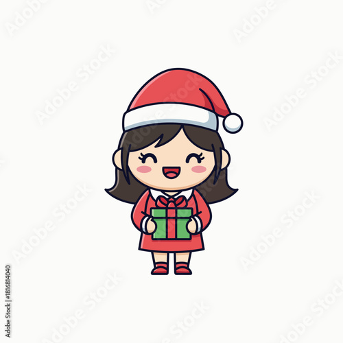 Cute Emma the Gift Wrapper character icon, flat vector style. Happy woman holding wrapped present, festive holiday service concept, cheerful expression.