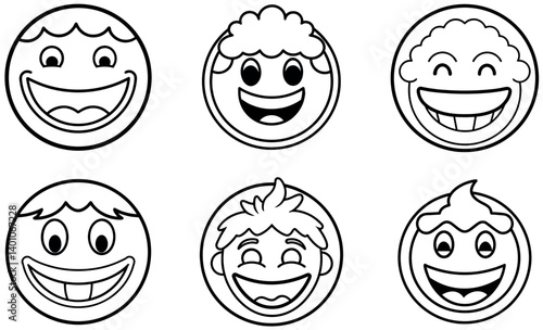 Cute Emoji Faces with Smiles - Character Illustrations, Cartoon Line Art