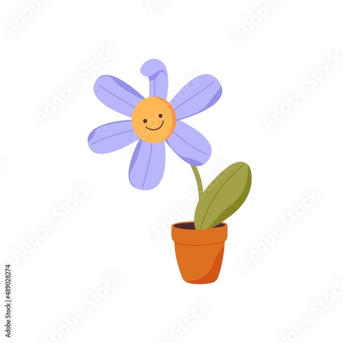 Cute flower growing in pot. Funny happy floral plant with smiling face in flowerpot. Childish bloom with eyes and mouth in planter. Kids flat vector illustration isolated on white background