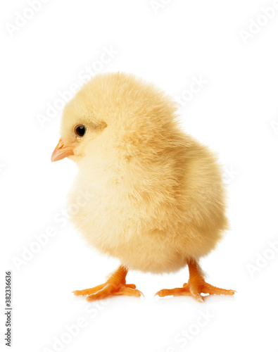Cute fluffy baby chicken on white background. Farm animal