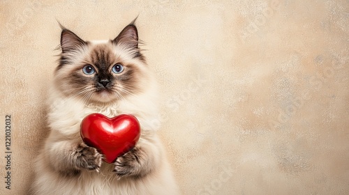 Cute fluffy ragdoll cat holding red heart on beige background