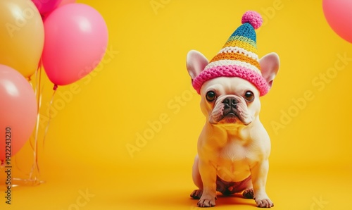 Cute French Bulldog in Colorful Party Hat Surrounded by Balloons on Bright Yellow Background