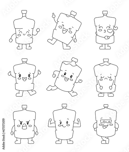 Cute funny plastic bottle characters. Coloring Page. Cartoon kawaii water with arms and legs. Hand drawn style. Vector drawing. Collection of design elements.