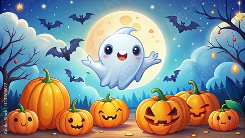 Cute Ghost, Bats & Pumpkins: Happy Halloween Cartoon Illustration