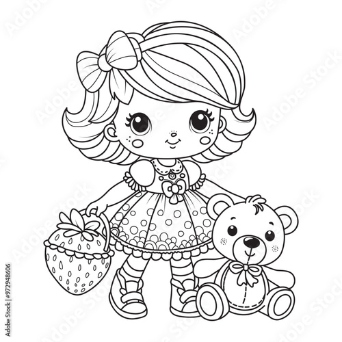 Cute girl with strawberry and teddy bear. Coloring page for kids. Art therapy.