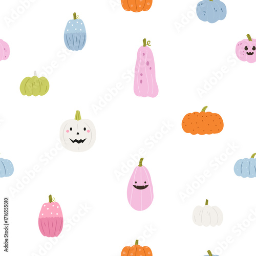 Cute Halloween Pumpkin Seamless Pattern. Colorful Holiday Background. Funny Cartoon Autumn Design.