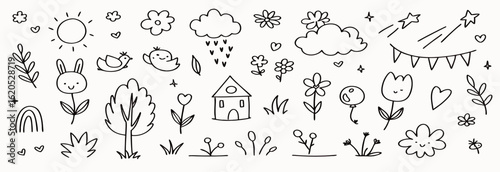Cute Hand Drawn Nature Elements: House, Flowers, Animals