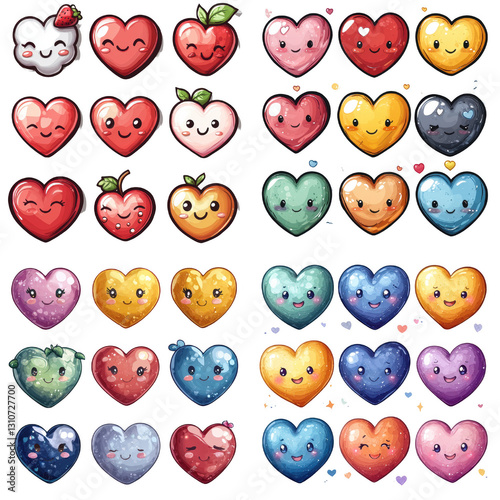 Cute heart shaped characters with various expressions and colors, resembling fruits and stars. Each heart has unique design, including strawberries, apples, and cosmic themes, conveying joy and