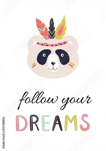 Cute indian baby panda, tribal animal with headband and feathers. Vector illustration for print, fabric design, cards, invitations.